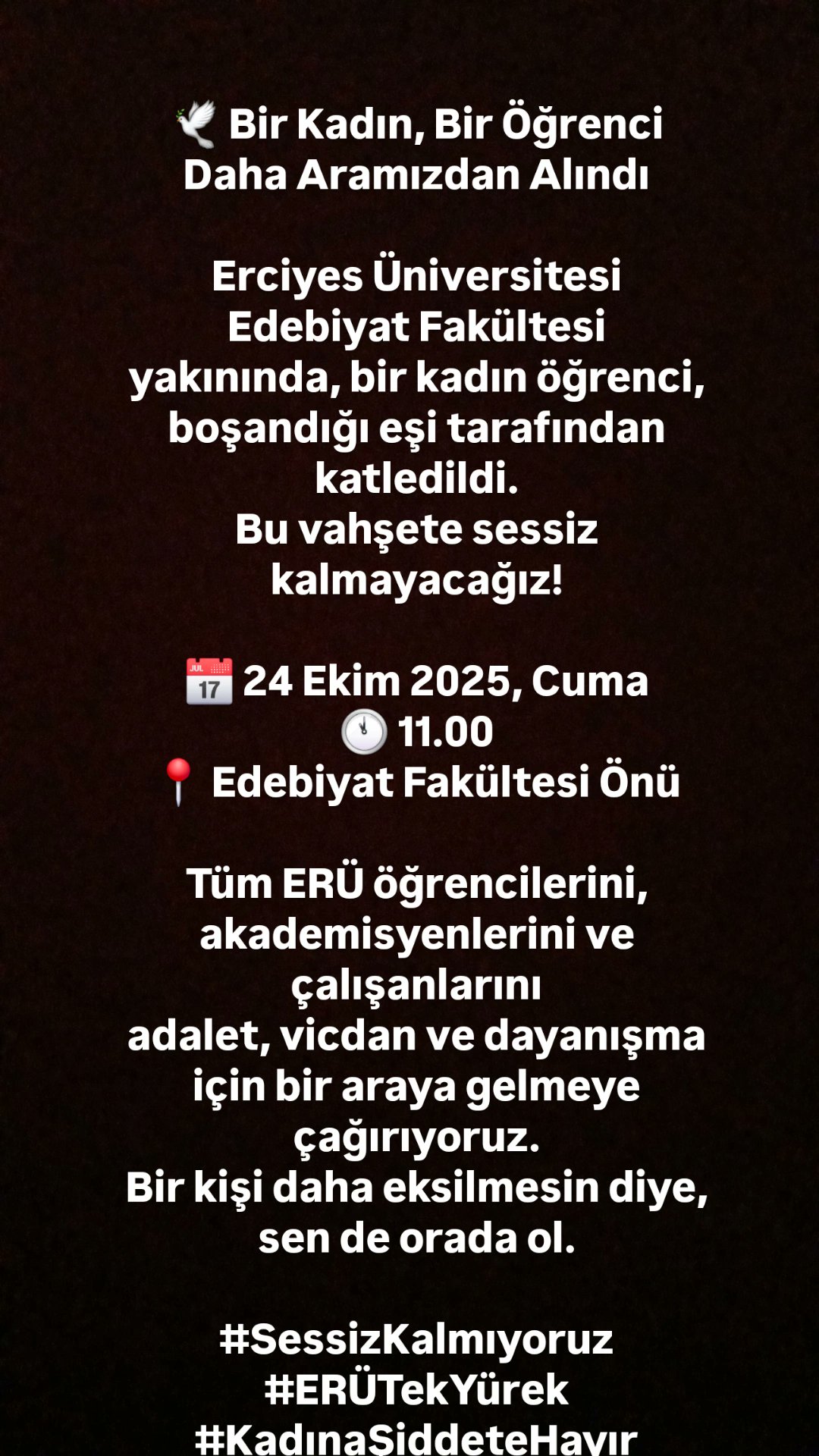 Yaşanan kadın cinayetinin ardından, cinayetin işlendiği Edebiyat Fakültesi önüne eylem çağrısı yapıldı. Yapılan çağrıda “Tüm ERÜ öğrencilerini, akademisyenlerini ve çalışanlarını adalet, vicdan ve dayanışma için bir araya gelmeye çağırıyoruz. Bir kişi daha eksilmesin diye, sen de orada ol” ifadeleri yer aldı. Eylem yarın (24 Ekim) 11.00’de fakülte önünde yapılacak” denildi.