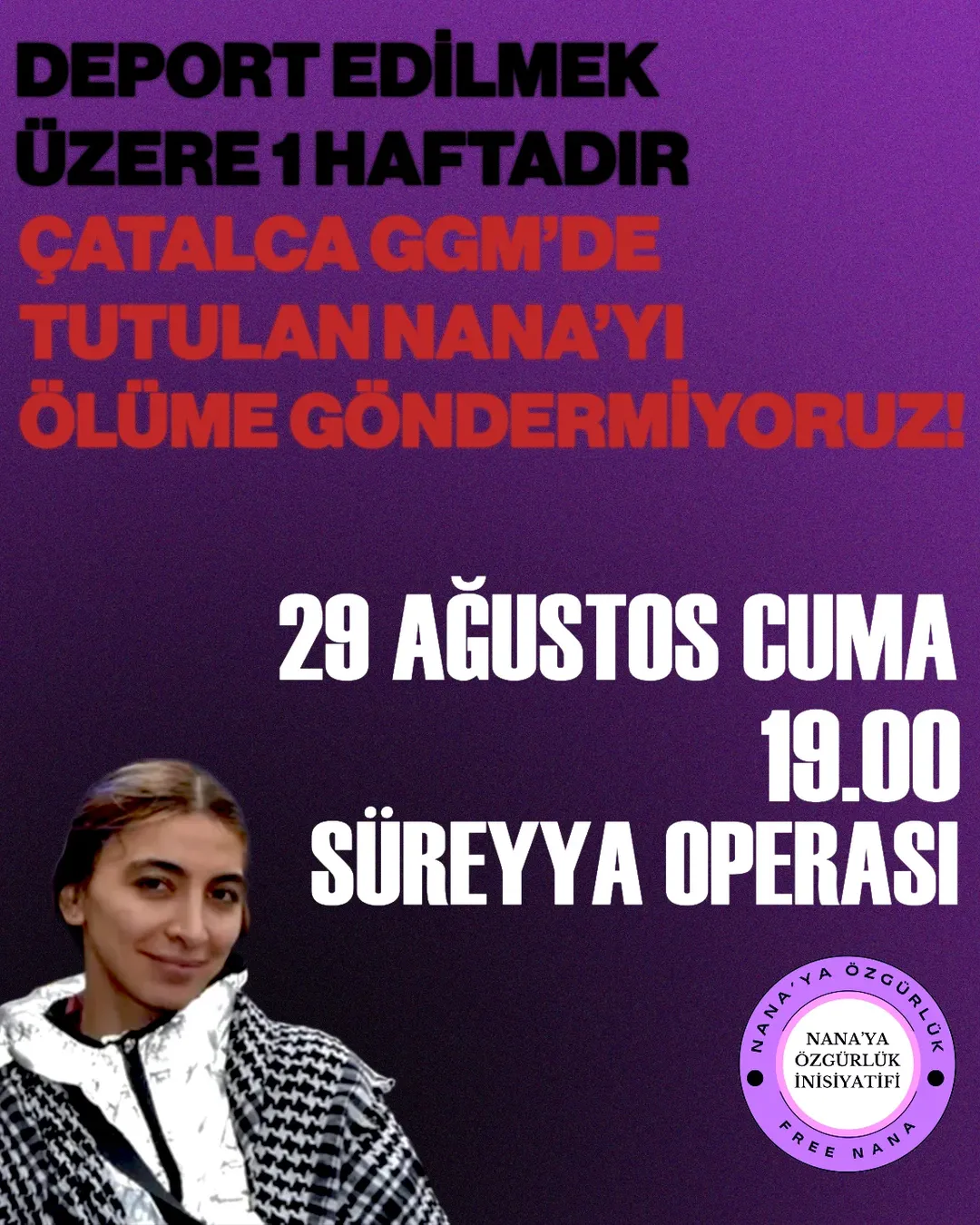 Nana’ya Özgürlük İnisiyatifi, “21 Ağustos’ta işyerinden gözaltına alınan ve günlerdir Geri Gönderme Merkezlerinde tutulup Azerbaycan’a gönderilmeye zorlanan arkadaşımız Nana için buluşuyoruz. Cuma günü saat 19.00’da Süreyya Operası önünde bir araya gelerek taleplerimizi yineleyecek, Nana’nın yaşadıklarını duyurmak ve bu hukuksuz işlemlere karşı sesimizi yükseltmek için bir araya geleceğiz.” diyerek herkesi dayanışmaya çağırdı.