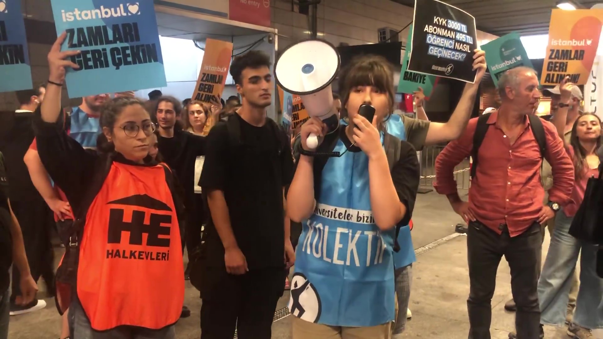 “Üniversiteliler olarak ulaşım zammına karşı turnikeden atladık, tüm halkımızı bizimle birlikte turnikeden atlamaya davet ediyoruz. Bize verilen 3000 TL’lik KYK bursuyla bizim beslenmemizi, KYK yurtlarında kalmamızı, hatta KYK yurdu çıkmazsa özel yurtlarda kalmamızı bekliyorlar. Biz 3000 TL olan KYK bursuyla yaşayamadığımızı en başından beri söylüyoruz. Yaşayamadığımızı söylememize rağmen ulaşıma tekrardan zam yapıldı. Bu, bu sene ulaşıma gelen ikinci zam. Öğrenci abonman ücreti 495 TL oldu. Eğer abonmanımız olmazsa 17 TL basmak zorunda kalıyoruz. Fakat bizim 3000 TL ile bunları karşılayacak paramız yok. Biz, ilk zam geldiği zaman İstanbul Büyükşehir Belediyesi önünde kartlarımızda kalan paramızı göstermiştik. Hatırlatayım, üniversitelilerin kartında olan para sıfır, paramız yok. Ulaşamıyoruz, beslenemiyoruz, yaşayamıyoruz. Üniversitelilerle birlikte de tüm halkımızı turnikelerden atlamaya davet ediyoruz.”